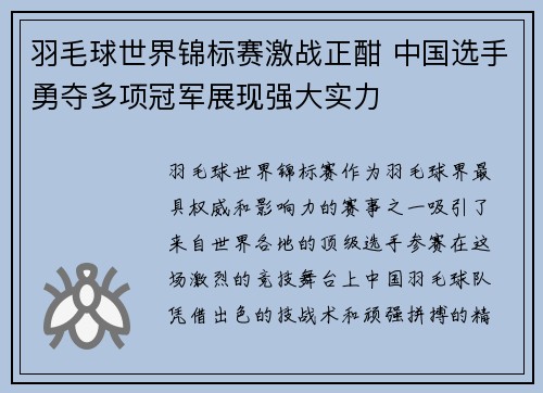 羽毛球世界锦标赛作为羽毛球界最具权威和影...