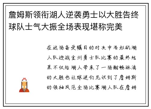 在这场备受瞩目的对决中,洛杉矶湖人队迎战...