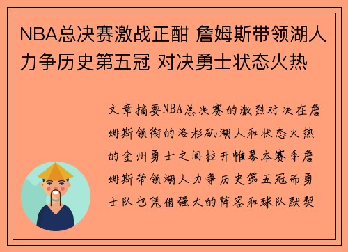 文章摘要:NBA总决赛的激烈对决在詹姆斯...