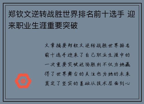 文章摘要:郑钦文逆转战胜世界排名前十选手...