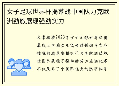 文章摘要:2023年女子足球世界杯揭幕战...
