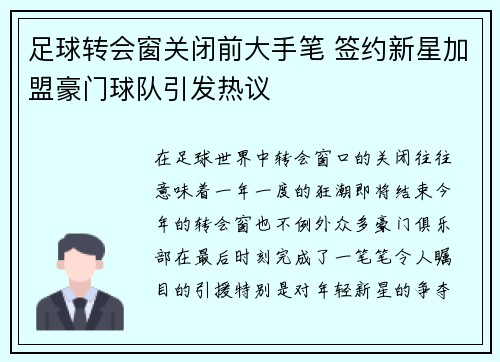 在足球世界中,转会窗口的关闭往往意味着一...