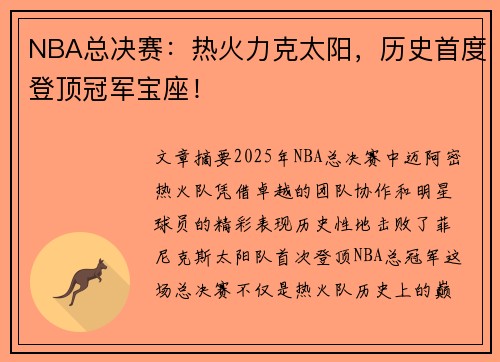 文章摘要:2025年NBA总决赛中,迈阿...