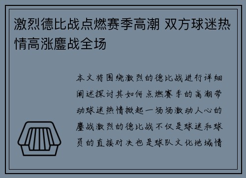 本文将围绕激烈的德比战进行详细阐述,探讨...