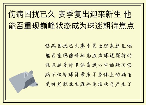 伤病困扰已久,赛季复出迎来新生,他能否重...