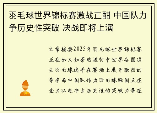 文章摘要:2025年羽毛球世界锦标赛正在...