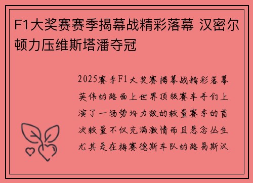 2025赛季F1大奖赛揭幕战精彩落幕,英...