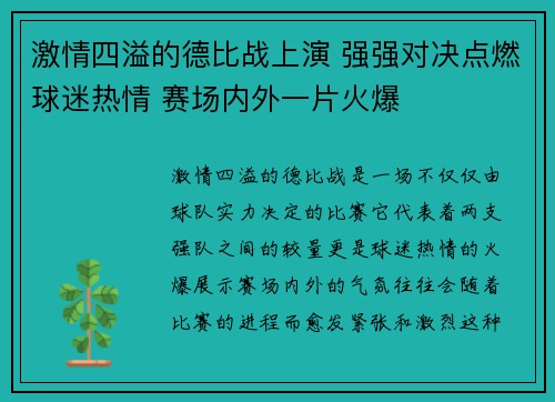 激情四溢的德比战是一场不仅仅由球队实力决...