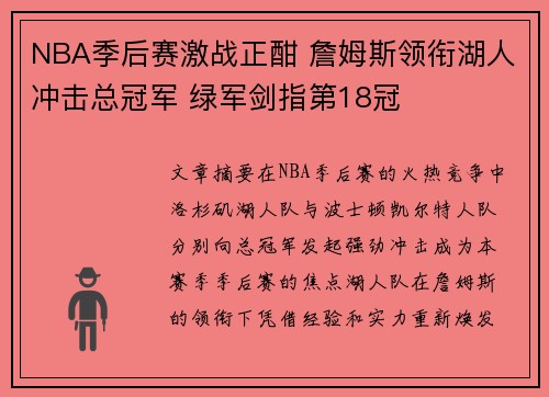 文章摘要:在NBA季后赛的火热竞争中,洛...