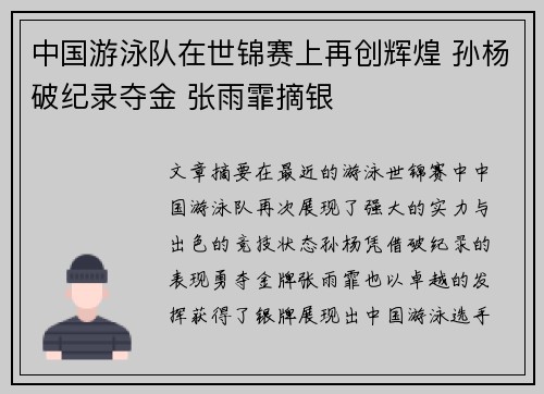 文章摘要:在最近的游泳世锦赛中,中国游泳...