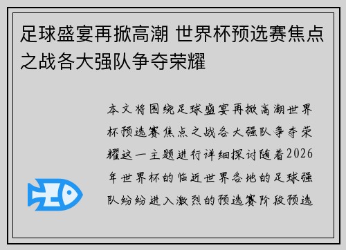 本文将围绕“足球盛宴再掀高潮,世界杯预选...