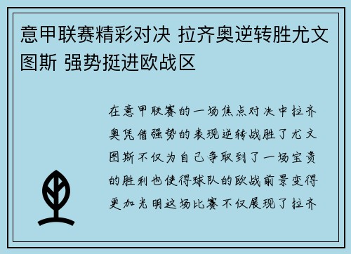 在意甲联赛的一场焦点对决中,拉齐奥凭借强...