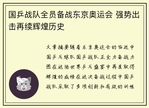 文章摘要:随着东京奥运会的临近,中国乒乓...