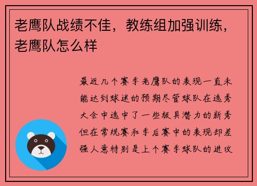 最近几个赛季,老鹰队的表现一直未能达到球...