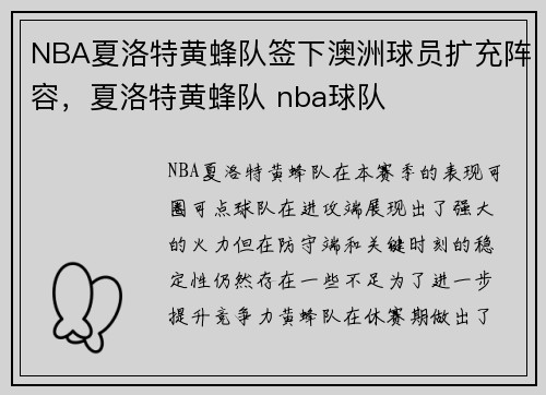 NBA夏洛特黄蜂队在本赛季的表现可圈可点...