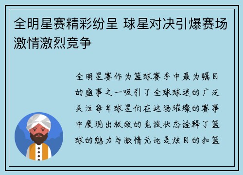 全明星赛作为篮球赛季中最为瞩目的盛事之一...