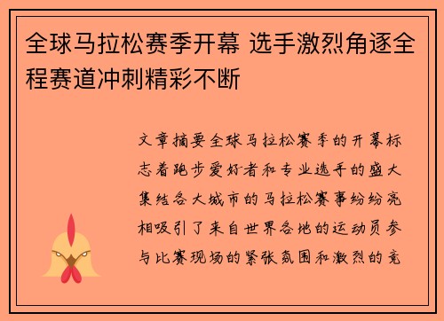 文章摘要:全球马拉松赛季的开幕标志着跑步...