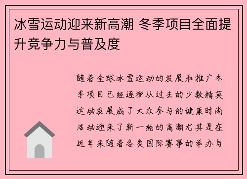 随着全球冰雪运动的发展和推广,冬季项目已...