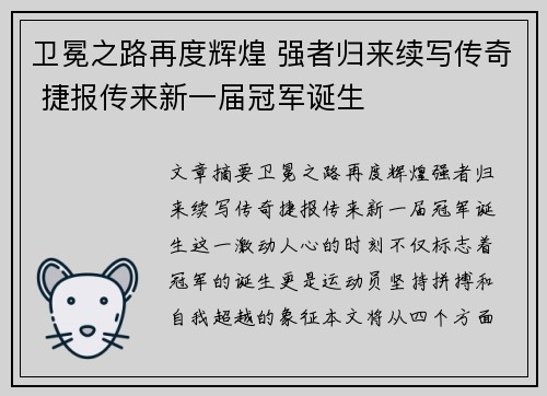 文章摘要:卫冕之路再度辉煌,强者归来续写...