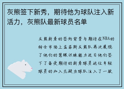 灰熊新秀的签约背景与期待 在NBA的转会...